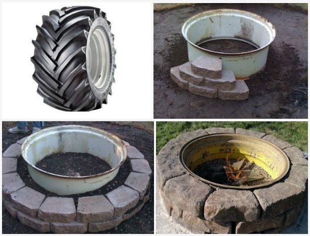 Еще один вариант, когда колесный диск становится основой кирпичного очага..