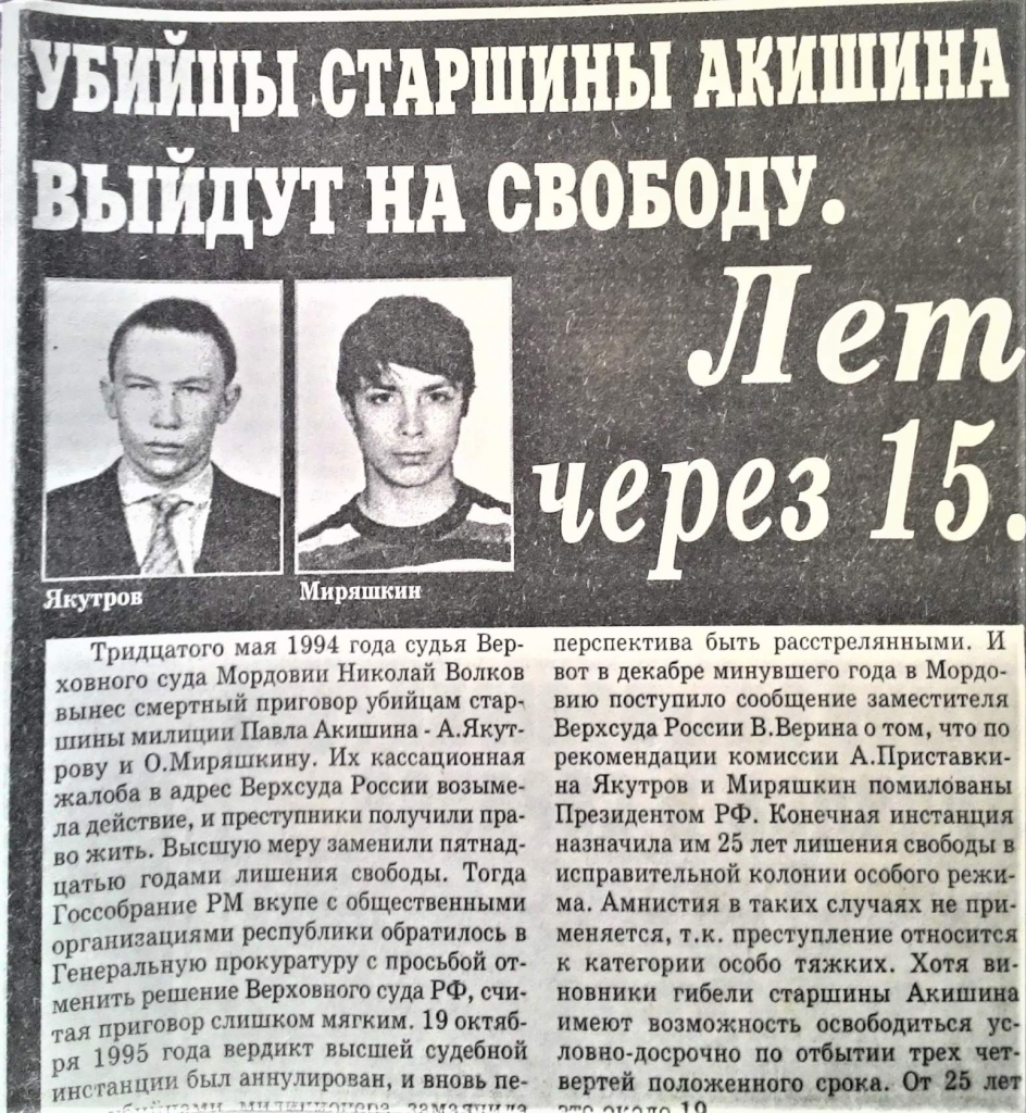 В этом обращении, в частности, говорилось: "Приговором Верховного Суда Республики Мордовия от 30 мая 1994 года активные члены организованной преступной группировки г. Саранска Якутров А.В. и Миряшкин О.В., организовавшие и совершившие 18 декабря 1992 года заказное умышленное убийство одного из лучших сотрудников госавтоинспекции Мордовии старшины милиции Акишина П.В. за добросовестное исполнение последним своего служебного долга, были приговорены к исключительной мере наказания–-расстрелу.