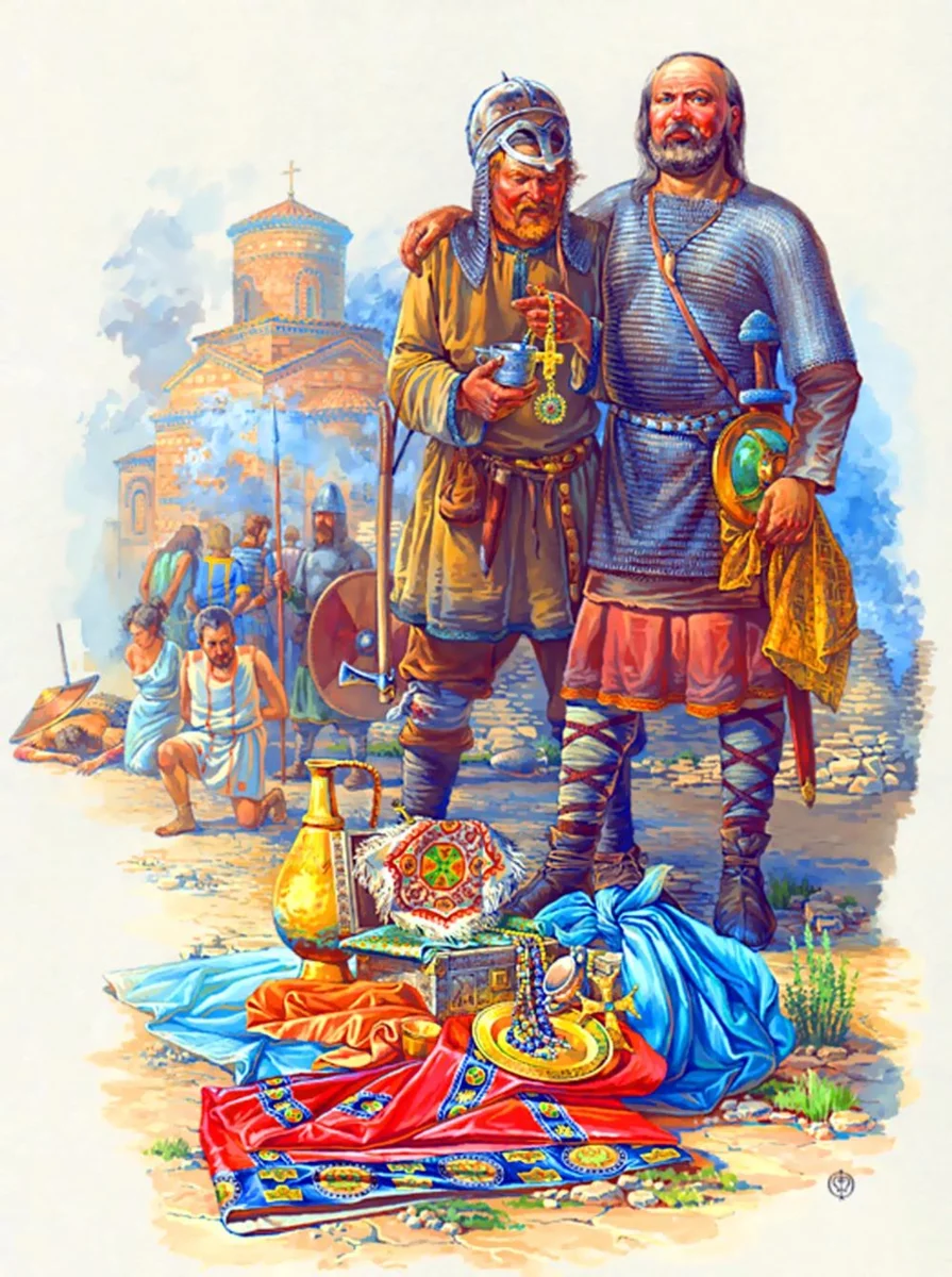 Русы были известны древним арабам не только своей внешней красотой, купечеством и шокирующими обычаями, но и воинственностью. Ат-Табари в 914 году приводил письмо правителя Дербента арабскому халифу, в котором говорилось: