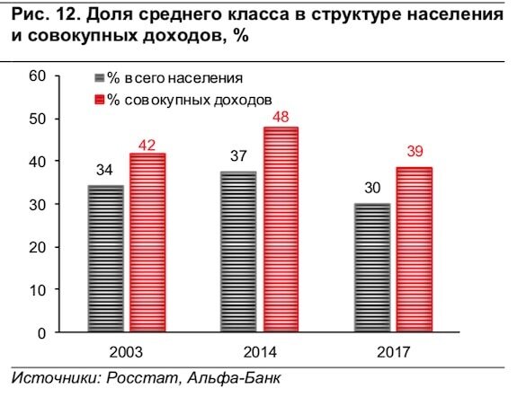 Средний класс в России оказался главной жертвой кризиса. За три года - с 2014-го по 2017-й - порядка 7% граждан РФ выпали из категории условного «среднего класса», а его общая численность снизилась с 37% до 30% населения, подсчитали аналитики Центра макроэкономического анализа Альфа-банка. Сопоставимым оказалось и сокращение их доли в общих доходах: с 48% в 2014 году до 39% в 2017 году, а сейчас он стал еще меньше.
