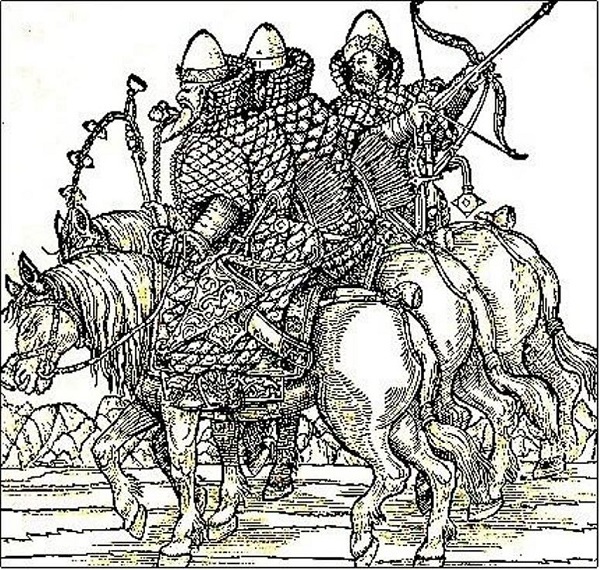 — когда Господин Герцог (Царь Иван III) хочет выступить с конницей в какой-нибудь поход, через 15 дней в его распоряжение предоставляются в каждом городе и деревне намеченные и выделенные для него люди, по каждой провинции, так что всего вместе собираются двести и триста тысяч коней и что оплачиваются они общинами, городами и деревнями в течение всего времени, на которое названный их господин хочет их занять. Тартары, живущие у границы, дают ему еще множество конных. [Говорил он], что во время войны они пользуются легкими панцирями, такими, какие употребляют мамелюки султана, и наступательным оружием у них являются по большей части секира и лук; некоторые пользуются копьем для нанесения удара;