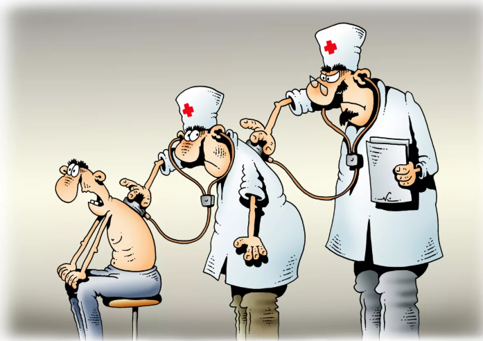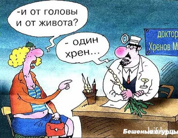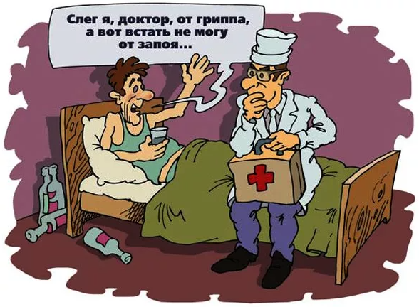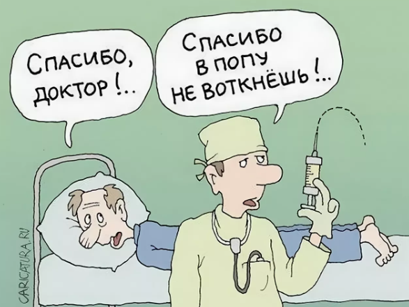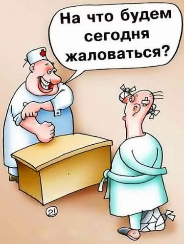 Доктор спрашивает на приёме у пациента: "На что жалуетесь?". Ответ: "На соседа". Во втором случае пациент услышал свой диагноз и спрашивает: "Доктор, а я жить-то хоть буду?". Ответ: "А смысл?".