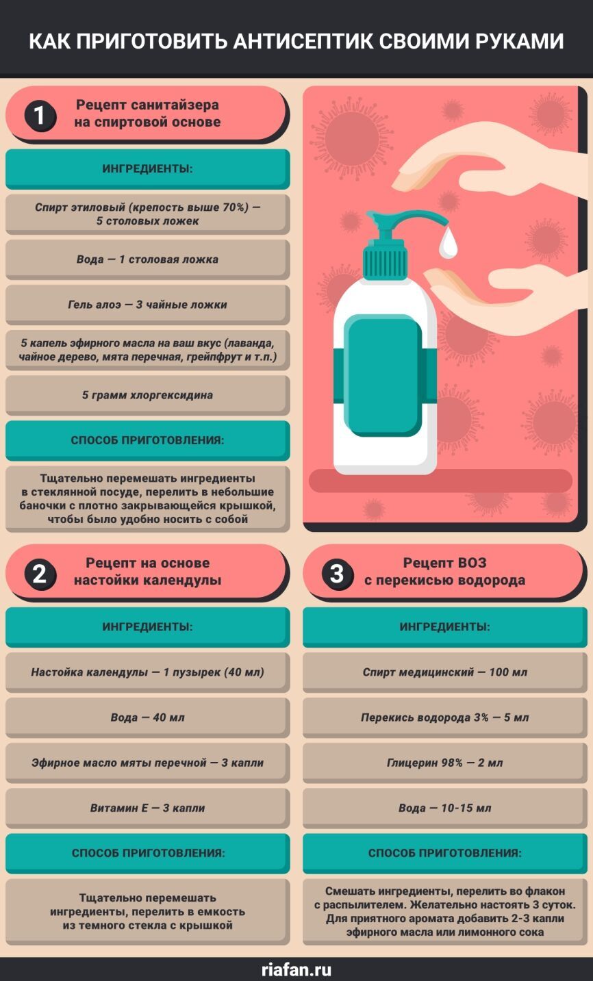 На картинке ниже, приведены три рецепта изготовления антисептика своими руками.