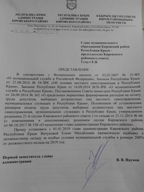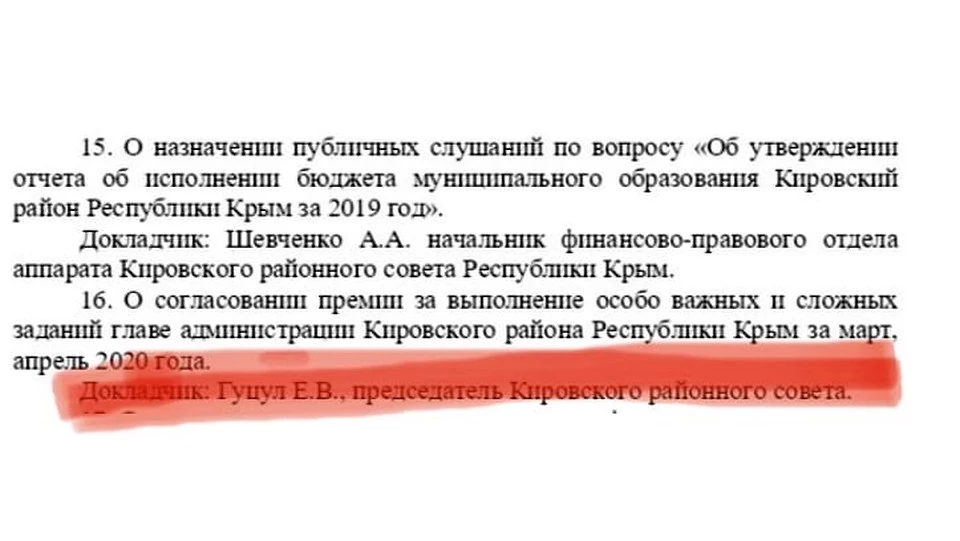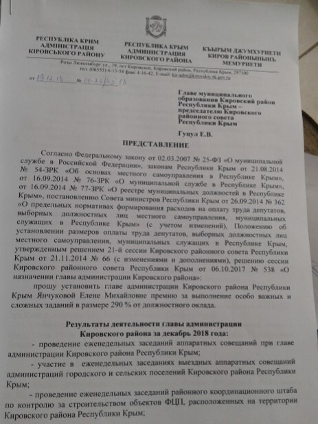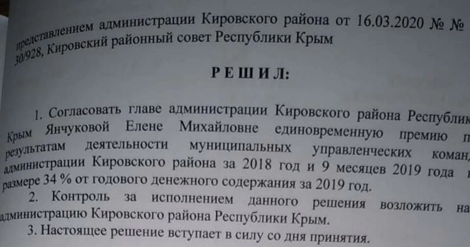 Читатели прислали в редакцию КП-Крым фрагмент решения Кировского районного совета, согласно которому главе администрации района Елене Янчуковой согласована единовременная премия в размере 34% от годового содержания за 2019 год.