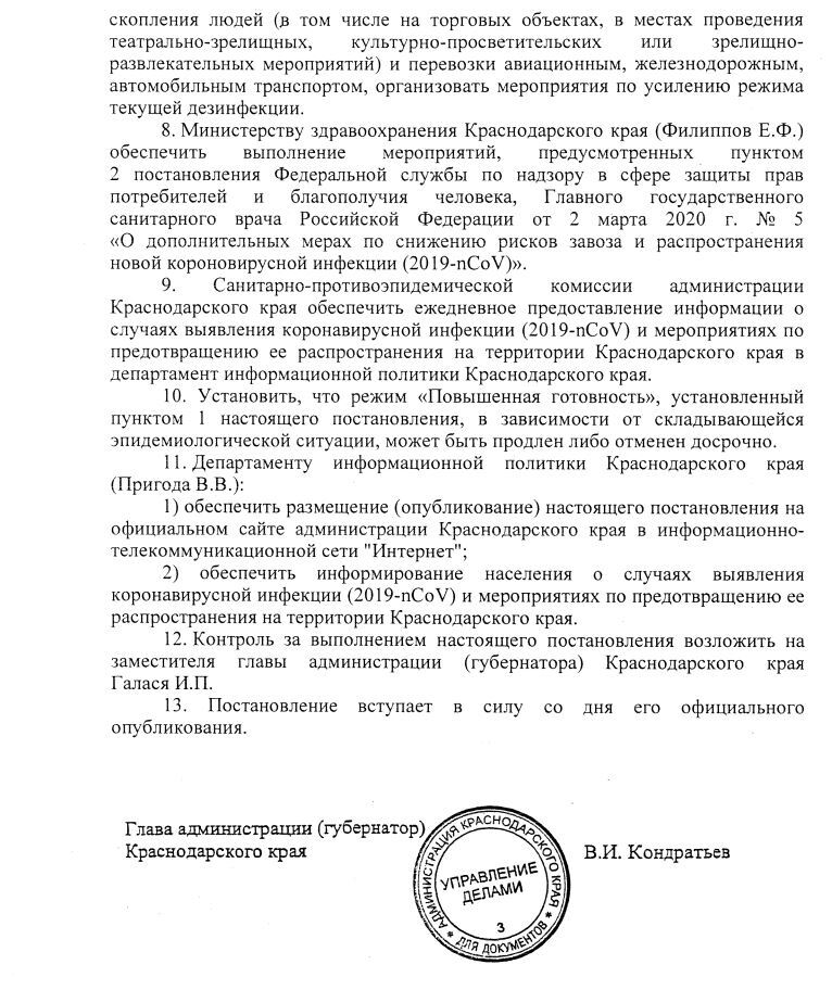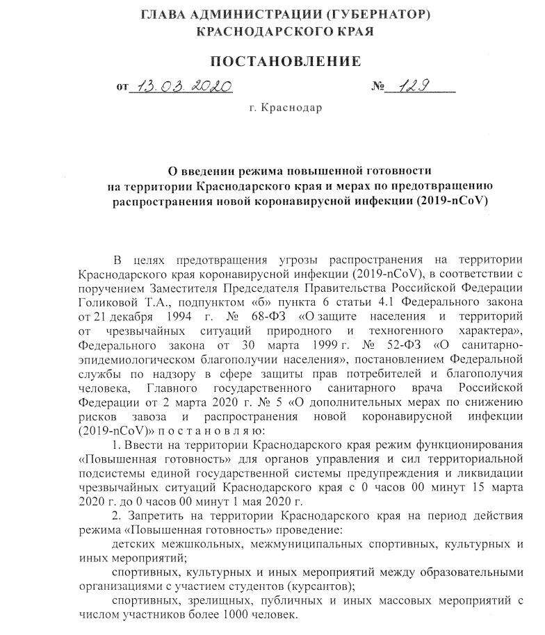 "В Краснодарском крае губернатор Вениамин Кондратьев подписал указ, запрещающий проведение массовых мероприятий с участием более тысячи человек. Документ размещен на официальном сайте администрации региона.