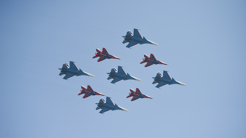В небе над Москвой пролетели четыре истребителя МиГ-31 К и истребители пятого поколения Су-57.