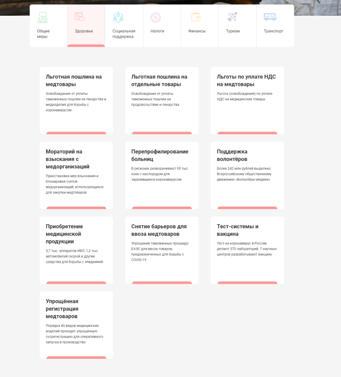 - Здоровье. Актуальные меры поддержки касаются медперсонала и обычных граждан. В их числе упрощённая регистрация медицинских товаров и льготы по уплате НДС.