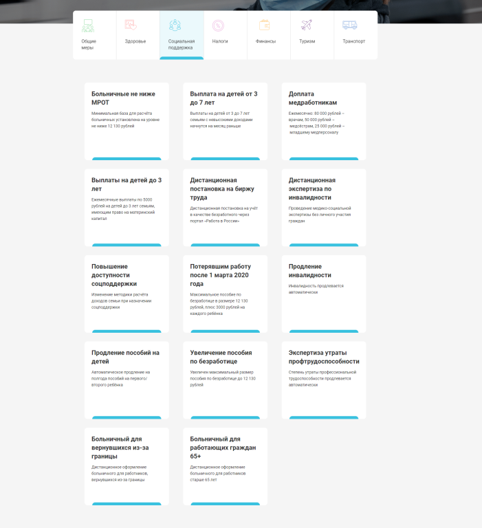 - Социальная поддержка. Льготные меры для физических лиц. Здесь можно найти информацию про больничные, которые до окончания пандемии будут начисляться в размере МРОТ, информацию по выплатам до 3-х лет и по доплате медработникам.