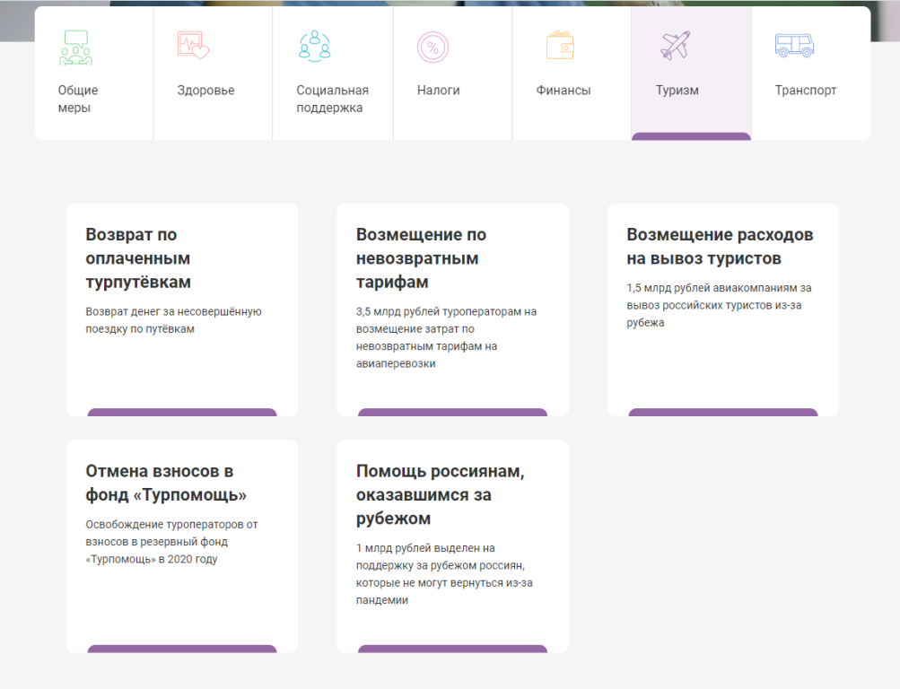 - Раздел "Туризм" касается возвратов потраченных средств на приобретённые путёвки и помощи россиянам, оставшихся за рубежём во время эпидемии коронавируса.