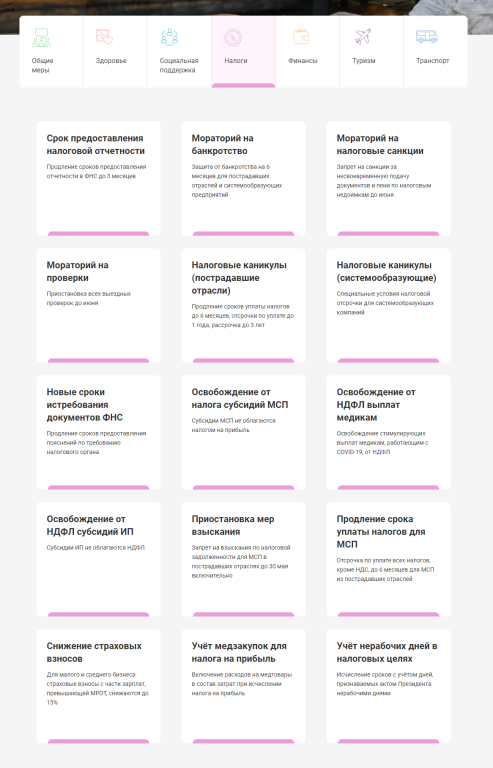 - Налоги. Раздел "Налоги" о налоговых каникулах и о снижении страховых взносов. Здесь можно узнать о сроках предоставления отчётности в ФНС и о моратории на налоговые санкции.