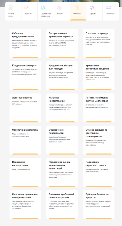 Теперь узнать обо всех мерах поддержки, введённых в связи с коронавирусом, можно на официальном сайте Правительства Российской Федерации.