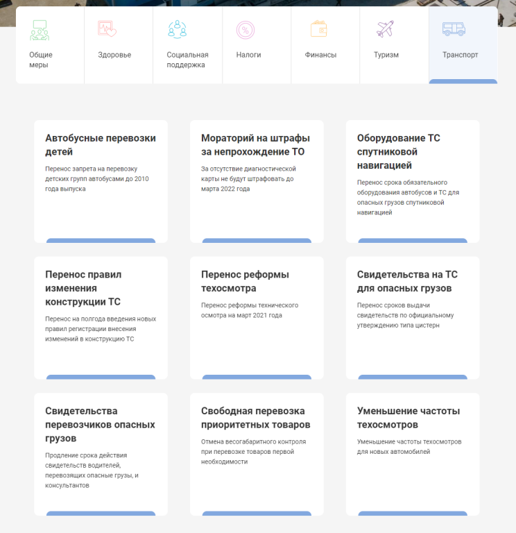 - В разделе "Транспорт" размещена информация о моратории на штрафы за не прохождение ТО. Также здесь можно посмотреть, как свободно перевозить товары первой необходимости.