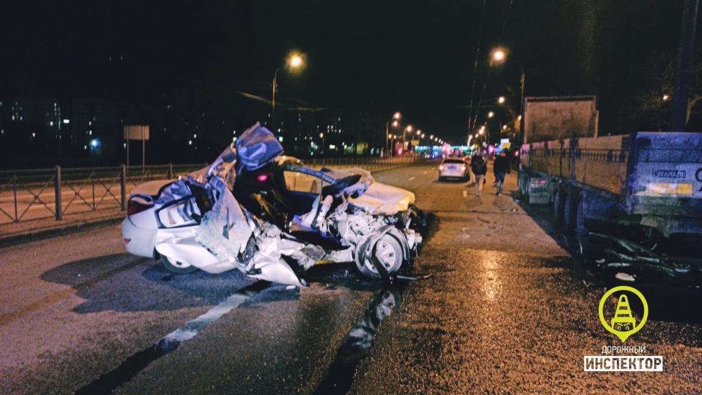 «Хёндэ Солярис» превратился в кучу искореженного металла, врезавшись в грузовик в Невском районе Петербурга. Водитель отделался испугом.