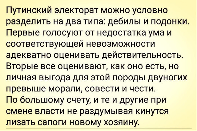 Вот и обоснуйте нам свою любовь к путину, может быть и таких комментариев в ваш адрес будет меньше, а то и совсем не будет. Обоснуйте, что повешение пенсионного возраста, тарифов и налогов, цен на всё и вся очень полезно для простых россиян, а снятие налогового бремени с пыниных дружков-олигархов - благо для населения РФ… Желательно с аргументами и фактами.