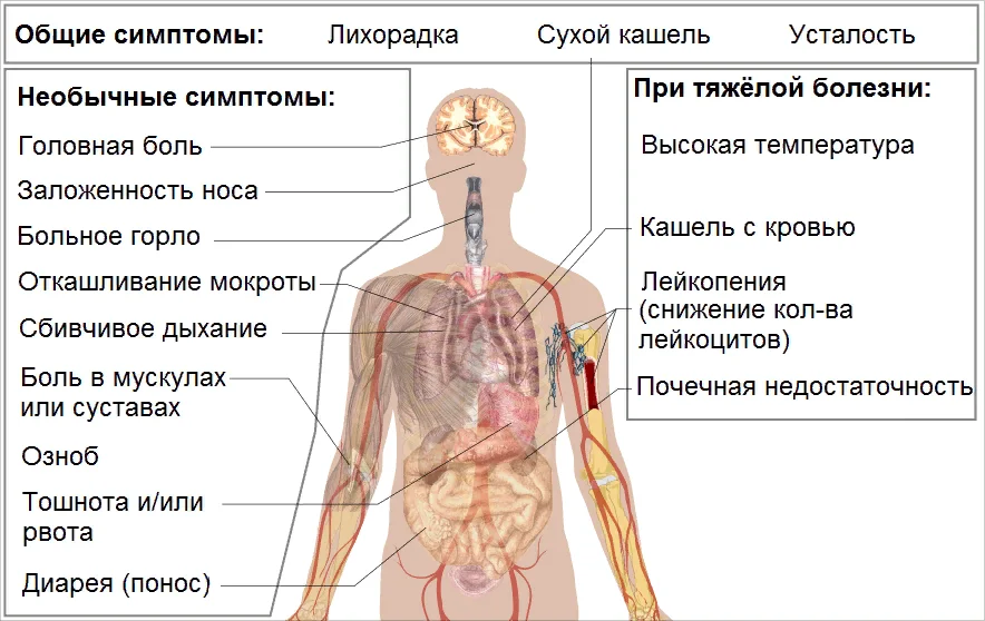 На сегодня полная клиническая картина COVID-19 не ясна, инфекция может протекать как вообще бессимптомно или в легкой форме, так и иметь тяжелую форму с риском смерти. Основные симптомы - классика ОРВИ. Самым главным признаком COVID-19 является повышение температуры тела до 37,5°C и выше, которые встречается практически в 90% случаев заболевания. Выше 39°C температура тела при COVID-19 поднимается у 12,3% пациентов. Вторым основным симптомом нового вируса является кашель (встречается в 67,8% случаев), мокрота отходит в 33,7% случаев.