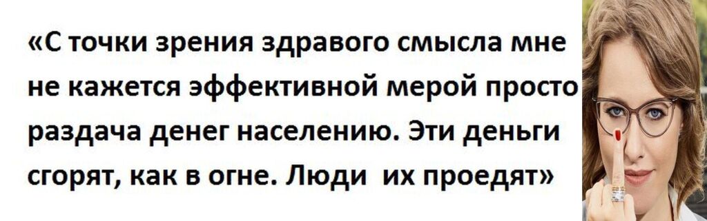 Как может помогать российскому народу ставленники США Греф, Набиулина, Силуанов и иже с ними. Они быстпрей всего помогут веревку намылить, чем выделить для своего народа копейку. Какая-то Собчак, основательница морально разлагающей передачи Дом-2, решает вопросы помощи русскому народу. Позор правительству России за его поведение в отношении населения страны в трудные моменты. Единственная страна из G-20, которая вместо помощи населению обложила его штрафами, причем в сумашедших размерах. По своей зарплате депутаты судили что ли, когда определяли размеры штрафов!