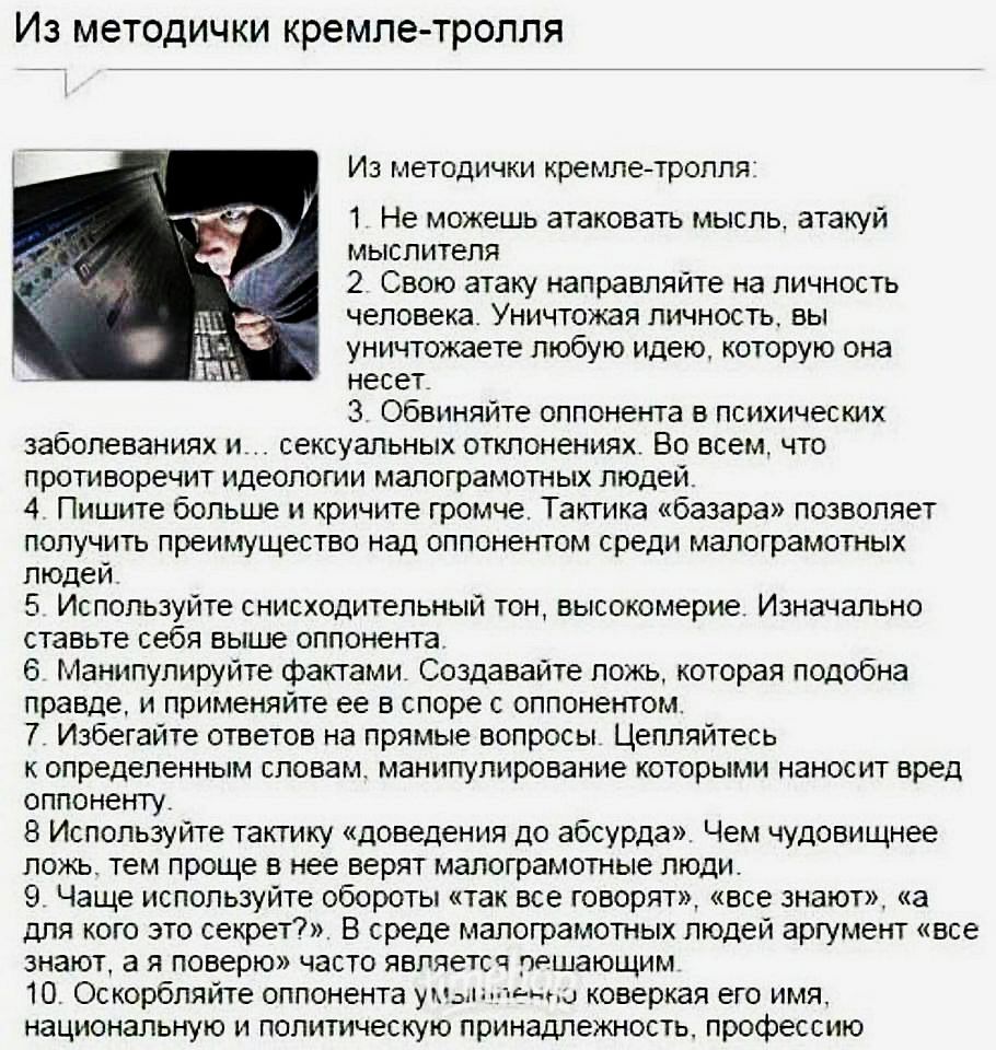 Так это ж методичка госдепа для поддержки"капец-предателей" в России. В ней под заголовком "Методичка кремлебота (троля) специально собраны все неудобные для псевдолиберальных бойцов информационного фронта вопросы и эмоциональные выпады оппонентов. Очень удобная штука. На барашков, пасущихся на богатых нивах жёлтой прессы и болотах фейков и информационных вбросов действует гипнотически. Чуть что неудобный для врага вопрос ему достаточно вытащить "кремлеботовскую методичку" ,тем самым скомпрометировать и уничтожить оппонента. Какой же всё таки будет ответ на-А укрыться есть где?