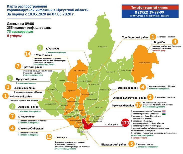 По данным на утро 7 мая, прирост за сутки в Иркутской области составил 18 человек. Всего 255 инфицированных. В Иркутске девять человек заболели по контакту, один приехал из Москвы и двое из обсерватора. Шестеро заболевших из области – у них разные пути заражения.