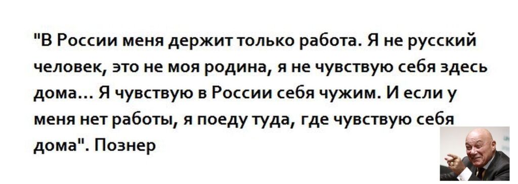 Уважаемая Елена Дмитриевна! Неважно кто, Познер ли "человек мира", либо псевдо либералы двух мастей (ельцинисты и путинисты), по сути инопланетяне и иже с ними. Если они живут и богатеют в нашей стране, и при этом систематически плюют ядовитой слюной в душу россиян с широких экранов, занимаясь открытой русофобией, это неприемлимо. Никакая это не независимая позиция "оппозиции", это 5-я колонна в России, порождение ельцинско - путинской власти. Истинная оппозиция критикует и обличает власть... 5-я колонна пытается очернить народ, страну, ее историю... неправильный народ... неправильная страна... неправильная история... даже русский язык и тот неправильный.