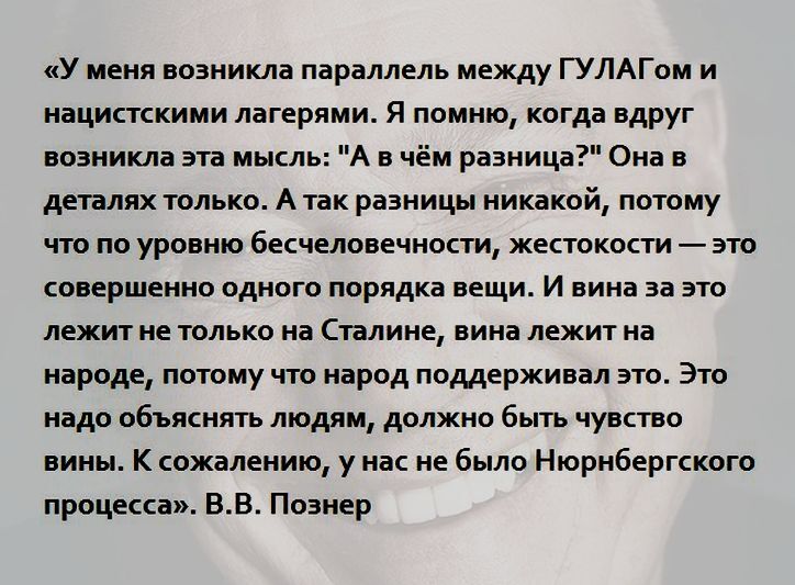Конкретно в чем-то на 100%...тот же Гулак, мой дед был "врагом народа" (58 ст),12 лет... за то,что не побоялся сказать ПРАВДУ! Репрессирован. Какие страшные, жуткие вещи он рассказывал. В концлагерях над пленными издевались нацисты, а здесь "СВОИ" над своими, ещё и получая, в последствии, участника ВОВ. В чём тут Познер не прав?