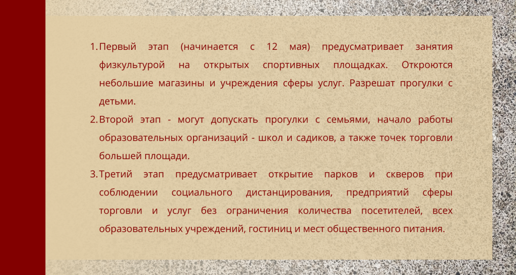 В свою очередь глава Роспотребнадзора Анна Попова официально заявила, что уже с 12 мая начнут постепенно (в 3 этапа) снимать ограничения.