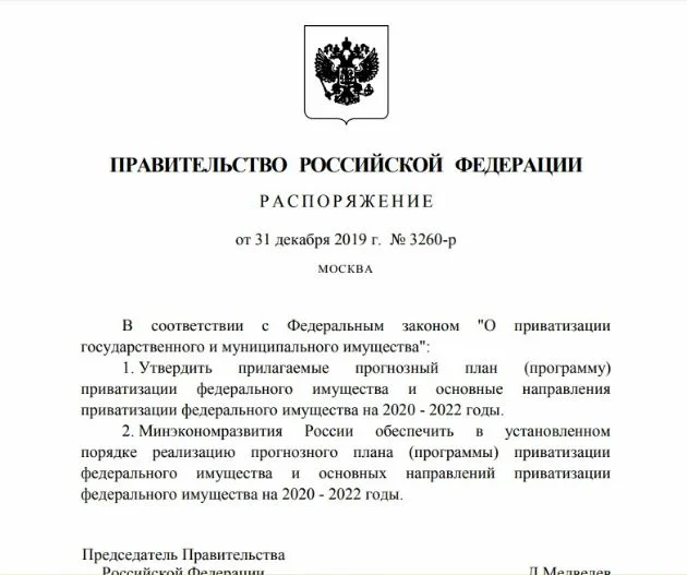 Представляю вашему вниманию Распоряжение Правительства РФ от 31.12.2019 N 3260-р. Сам документ достаточно громоздкий (его легко можно найти в интернете). Он включает в себя перечень предприятий, которые должны быть приватизированы в 2020-2022 годах. Сами предприятия из абсолютно разных сфер деятельности, например, Производство электрического оборудования, Производство пищевых продуктов, Научные исследования и разработки и другие. Также под приватизацию подпадают земельные участки и строения. Сами объекты разбросаны на всей территории нашей необъятной родины.