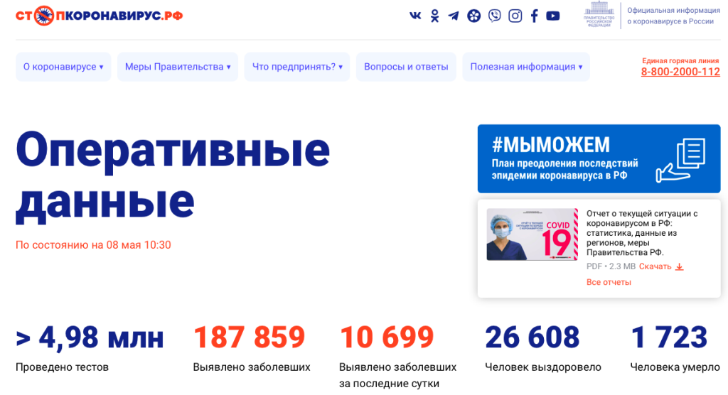 Число новых заболевших коронавирусной инфекцией CОVID-19 за 7 мая перевалило уже за 11 000 человек (11 231 человек за последние сутки и 177 260 человек заразившихся за весь период в целом). На сегодняшний день, 8 мая, число заболевших чуть меньше, чем за вчерашний день, и составляет 10 699 человек за последние сутки.