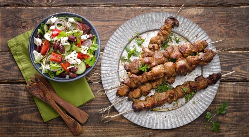 Конечно, к мясу лучше всего готовить салат из свежих овощей, например, греческий. Для этого нужно взять по 2 спелых крупных помидора и огурца, один сладкий красный перец, красную луковицу, 100 грамм оливок или маслин, 100 грамм брынзы или феты, листья зеленого салата. Помидоры и огурцы нарезать ломтиками, перец и сыр – кусочками, а лук – тонкими полукольцами.