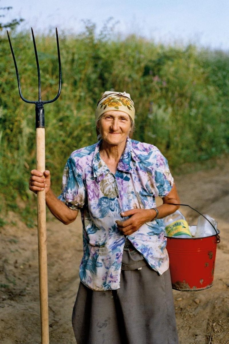 An old farmer woman with pitchfork and bucket, Eastern Europe.