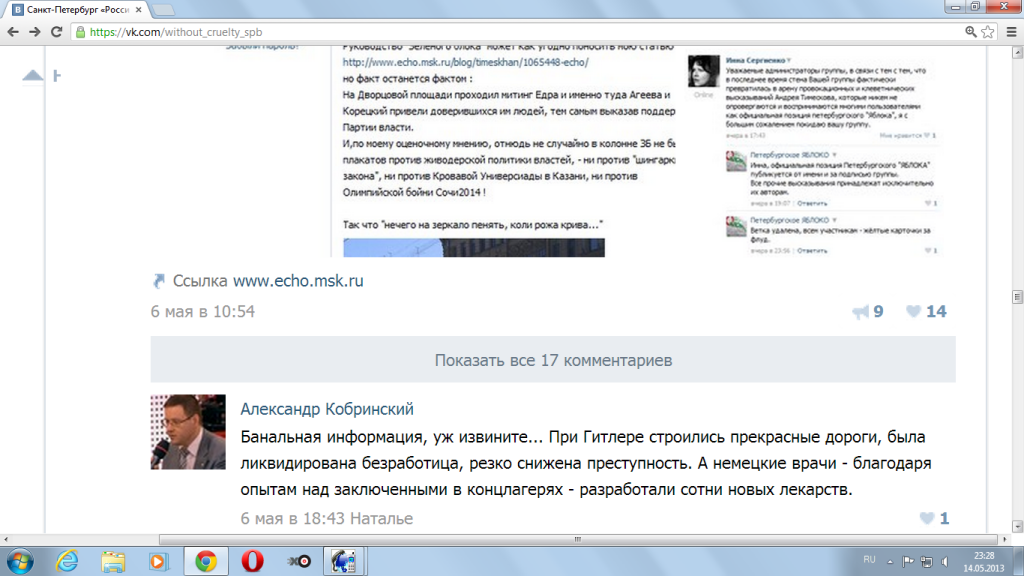 Например, член Бюро РОДП «ЯБЛОКО» Александр Кобринский, сравнительно недавно, публично восхищался "достижениями" Фюрера, в том числе и бесчеловечными медицинскими опытами на людях, которые проводили врачи-палачи в концлагерях. См. задокументированный скриншот ниже: