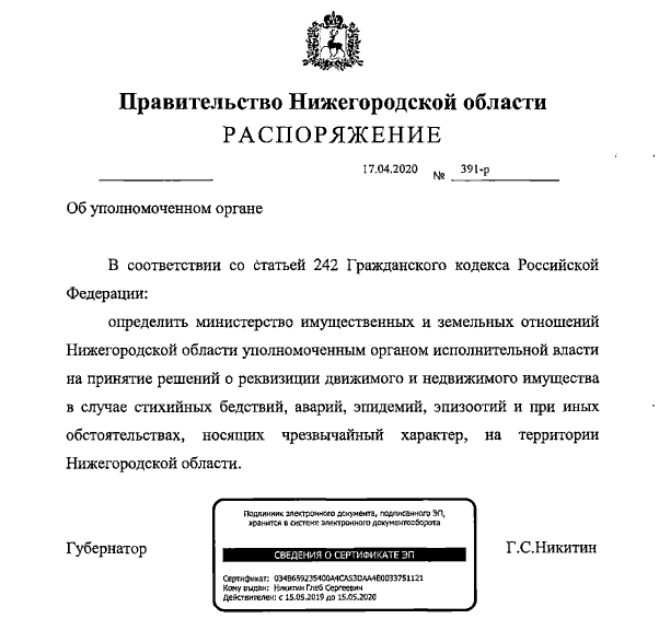 Например, недавно, как выяснилось, правительство выпустило распоряжение № р-391, подписанное главой региона 17 апреля 2020 года. Его содержание следующее.