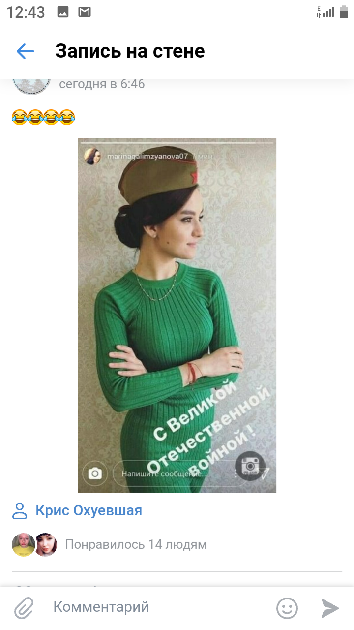 К сожалению, не грузится фото, но опишу. На фото, девушка в пилотке и подпись"С Великой Отечественной войной"!Странное поздравление, не правда ли?Выложила, ученица под НИКом "Крис оху*вшая" (фото, конечно же,не её,но смысл не меняется). Вот оно - "поколение"!