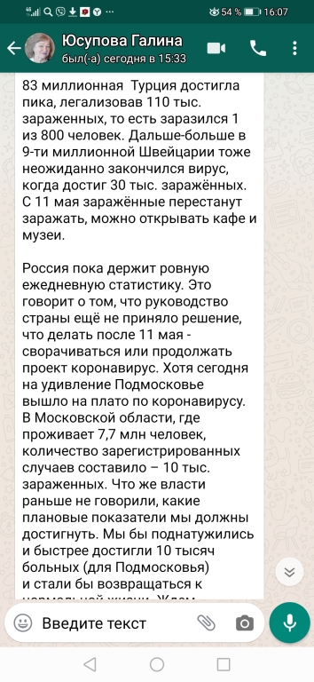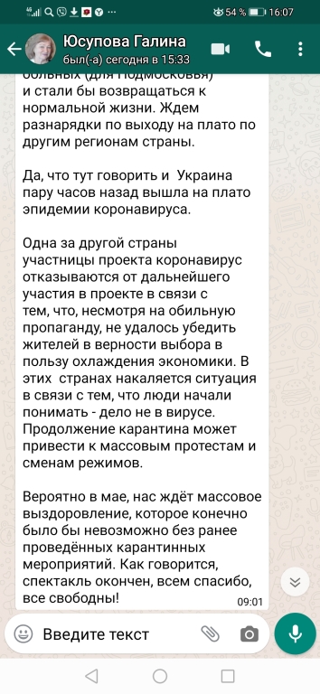 «Как долго мы будем продолжать в том же духе?... Именно этот вопрос сейчас волнует многие страны и Россия не исключение». Все правильно: до чертиков все надоело (ограничения, запреты, штрафы, ...)! Но самое главное это то, что многие (в т.ч. и я) с первых дней введения режима самоизоляции не верят в эту эпидемию. Причин для этого предостаточно (но я не буду сейчас это расписывать). Хочу сказать о другом... Вчера мне прислали одну информацию (о проекте «коронавирус»). Думаю, Вам тоже будет интересно ее прочитать (см. ниже), хотя, возможно, это и фейк, но, как мне кажется, это многое объясняет. А за публикацию спасибо!