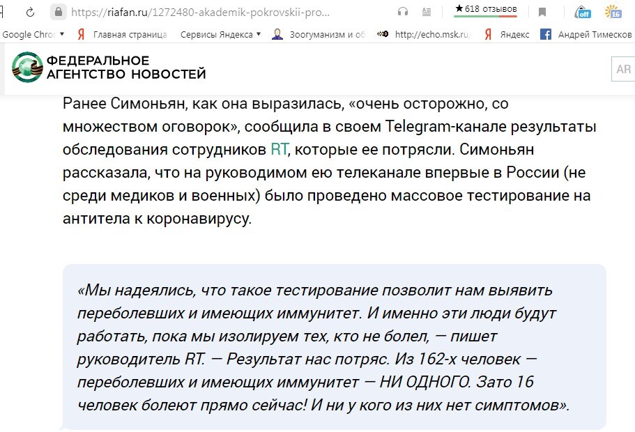 Одновременно с этим Главный редактор изданий "Раша Тудей" и "Спутник" Маргарита Симоньян выбросила в свой Телеграм-канал почти панический пост о результатах скрининг-теста на антитела к COVID-19 для своих работников, которых проанализировали всех поголовно: