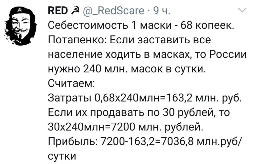 Проблема в том, что если бы цена маски была 3 рубля (как до пидермии), то проблемы бы вовсе не было! Если есть чем думать, включайтесь и думайте: кто создал эту проблему?