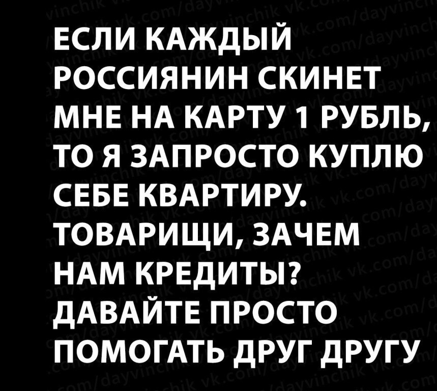 Таким образом, мы можем помочь друг другу и в кредитах, ипотеке и тд. А что, вариант не плохой, не надо банкротится, нервы трепать себе и тд. . А главное и не работать.