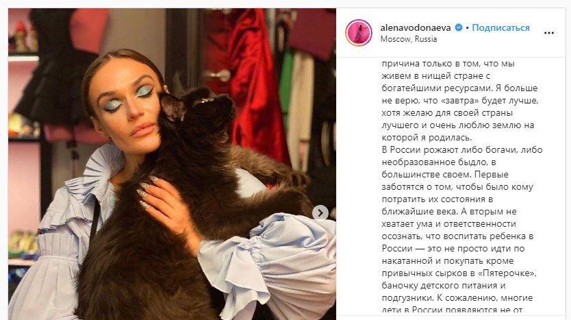 В начале года в центре скандала из-за высказываний о маткапитале в интернете оказалась телеведущая Алена Водонаева. Она, в частности, написала в одном из своих постов в Instagram****, что «отчаявшиеся от нищеты россияне или быдло, которому вечно не хватает на бутылку водки», будут заводить детей ради денег с этой выплаты.