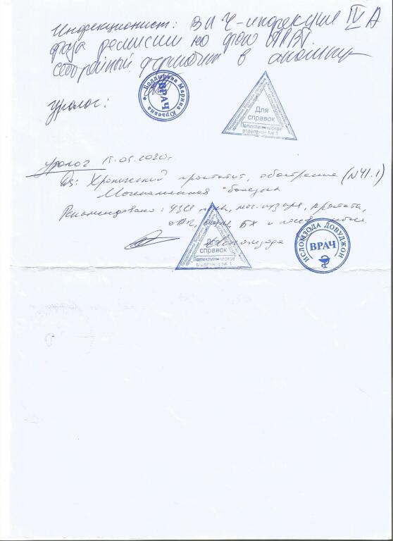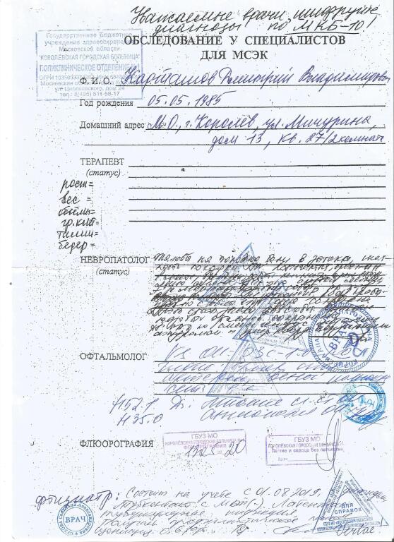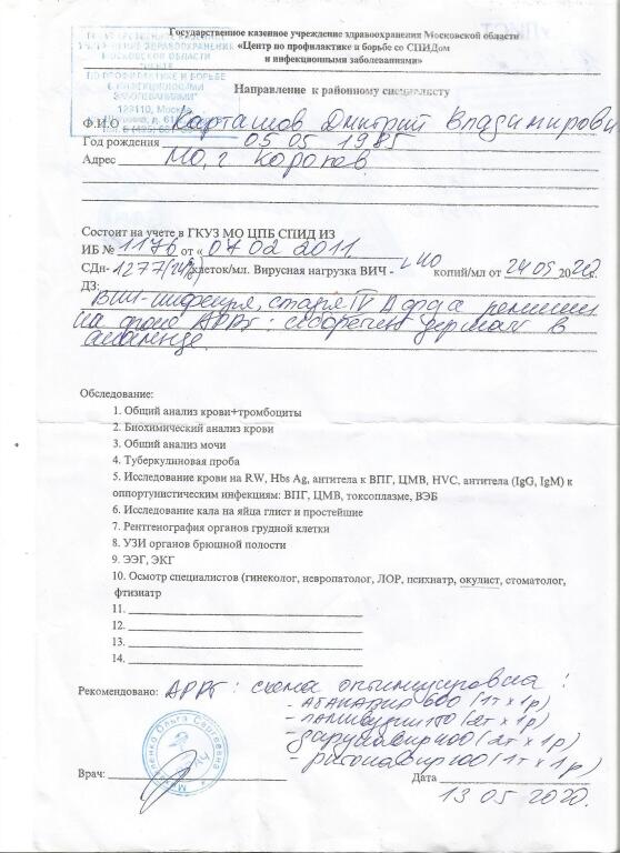 Основанием обращения с жалобой явилось то, что сами врачи и мешают диагностике и лечению! Я, гражданин Российской федерации, Карташов Дмитрий Владимирович, 05.05.1985 года рождения. С диагнозом: ВИЧ инфекция 4 Б стадия, психопатоподобная шизофрения, латентная туберкулёзная инфекция, нейросифлис. Не могу пройти элементарную флюорографию в лечебных учреждениях города Королёва, Московской области. Например, в противотуберкулезном диспансере неисправен рентгеновский аппарат. Во взрослой поликлиники района Костино как и в поликлинике района Юбилейный нет рентгенолаборантов. Единственная поликлиника в которой можно будет сделать флюорографию, это взрослая поликлиника на территории центральной больницы. Прикрепиться нет возможности, направляют по месту жительства и перед носом закрывают дверь, даже дежурные терапевты. Что и произошло 13.05.2020 года примерно в 14:00. Врачей инфекционистов нет! Со слов медицинских работников, они все работают в инфекционном стационаре. Врачи-специалисты работают в первую смену до 12:00 и то, через день. На коронавирус тесты проводит, только станция скорой медицинской помощи. А по факту всех отправляют в коммерческую лабораторию "Гематест", где услуги платные. Не возможно пройти обследование из СПИД центра и по направлению на МСЭК. Благодарность, можно выразить только СПИД центру, психоневрологическому диспансеру города Королева, противотуберкулезному диспансеру и конечно кожно-венерологическому диспансеру. Остальные отделения, можно просто закрыть! Узких специалистов перевести в диспансере, так мы ограничим чистую зону от грязной. Хамство и нежелание работать, вот к чему привел коронавирус.