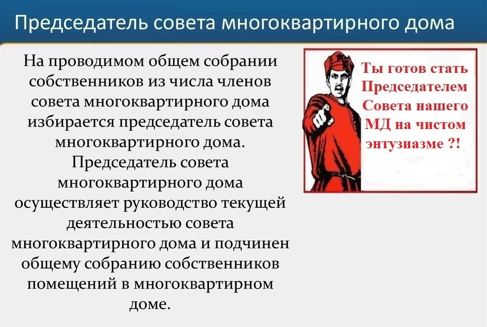 Рассуждать о том, что для исполнение обязанностей председателя совета многоквартирного дома достаточно всего навсего лишь "неравнодушного энтузиазма", может лишь тот, кто ни разу не пытался хотя бы организовать по своей личной инициативе в своем многоквартирном доме общее собрание собственников помещений, исходя из положений статей 44-48 ЖК РФ.