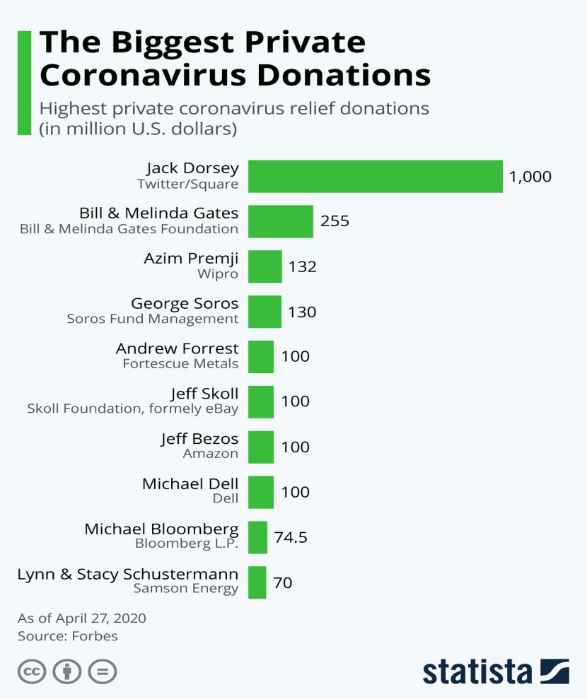 В конце апреля журнал Forbes насчитал 77 миллиардеров, которые пожертвовали средства на борьбу с COVID-19. Самое большое пожертвование поступило от сооснователя и гендиректора Twitter Джека Дорси. Он жертвует 1 миллиард долларов! И это более 1/3 своего состояния, по данным Forbes Real-Time, оно составляет $3,3 млрд.