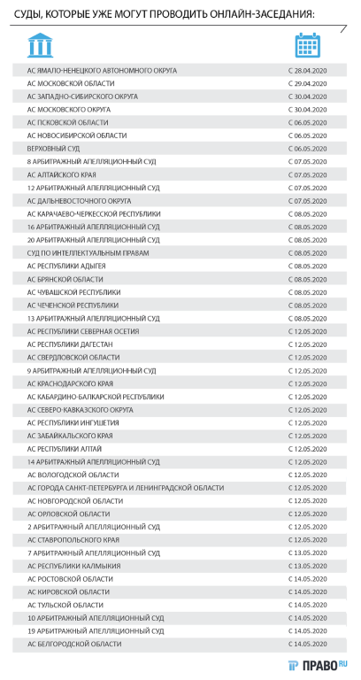Ранее президиумы Верховного суда и Совета судей рекомендовали судам при наличии технической возможности и с учётом мнений участников судопроизводства проводить заседания с использованием системы видео-конференц-связи. Для участия в онлайн-процессе стороны должны подать в суд электронное заявление с документами, удостоверяющими личность и подтверждающими полномочия.https://pravo.ru/news/221793/