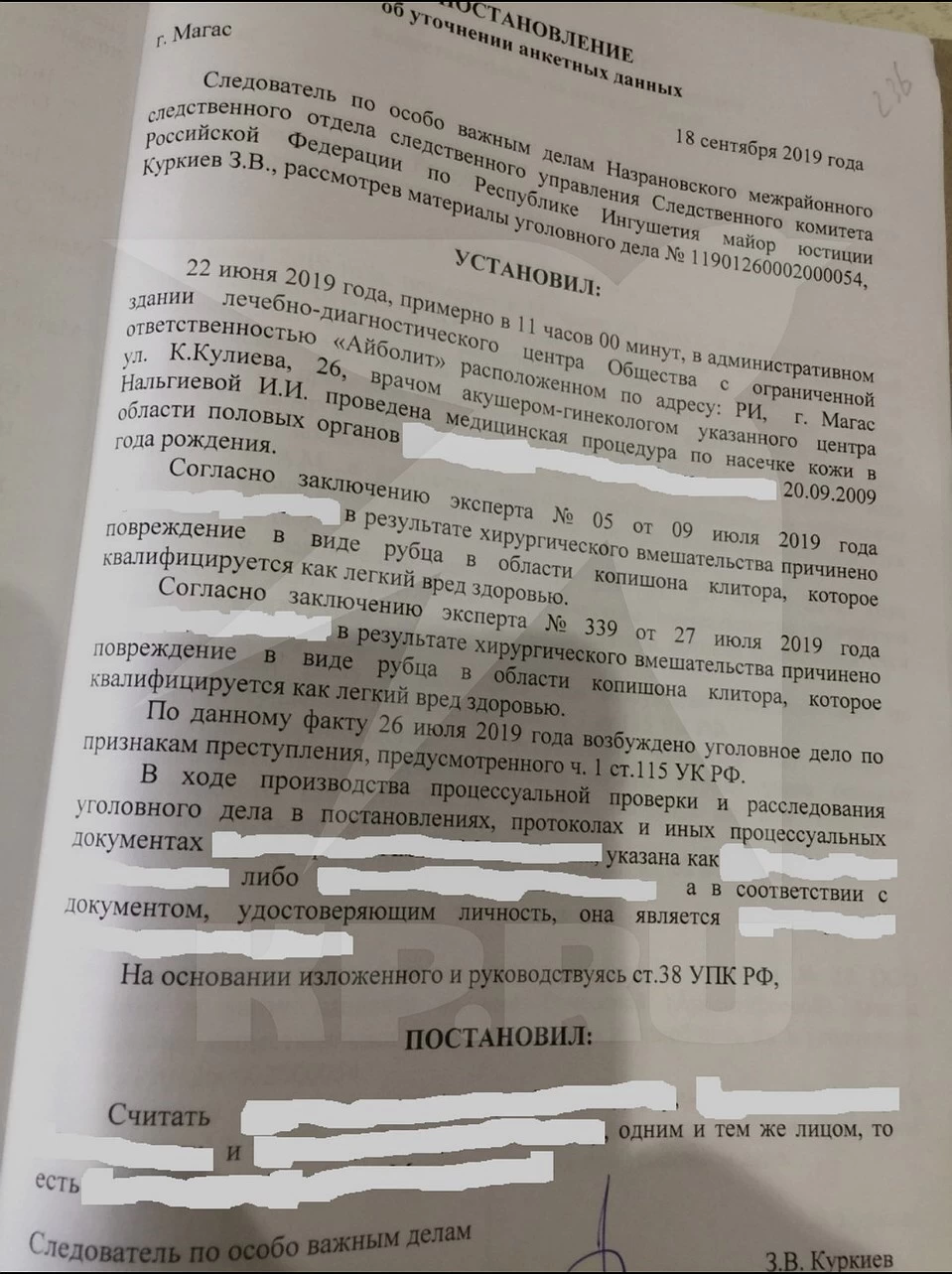 -Следователь опросил всех и назначил судебно-медицинскую экспертизу. В своем заключении судмедэксперт написал, что "состояние после ритуального обрезания". И заключил, что это "причинение легкого вреда здоровью". По этой статье теперь и судят гинеколога Нальгиеву, которая по факту оказалась вообще медсестрой стоматологического отделения. Так значится в ее трудовом договоре. Проверка клиники Росздравнадзором началась только в середине июля. К тому моменту руководство клиники подготовилось. "Нашлась" у них и карта, в которую вписаны несуществующие болезни, требовавшие «незамедлительной операции». Как они успели провести диагностику и получить анализы буквально за один визит - не понятно. "Нашлось" и согласие, вот только без подписи. И договор без подписи. Между тем, повторная медэкспертиза, она уже проходила в Ингушетии, так же установила, что проведена "калечащая операция по обрезанию женских половых органов".