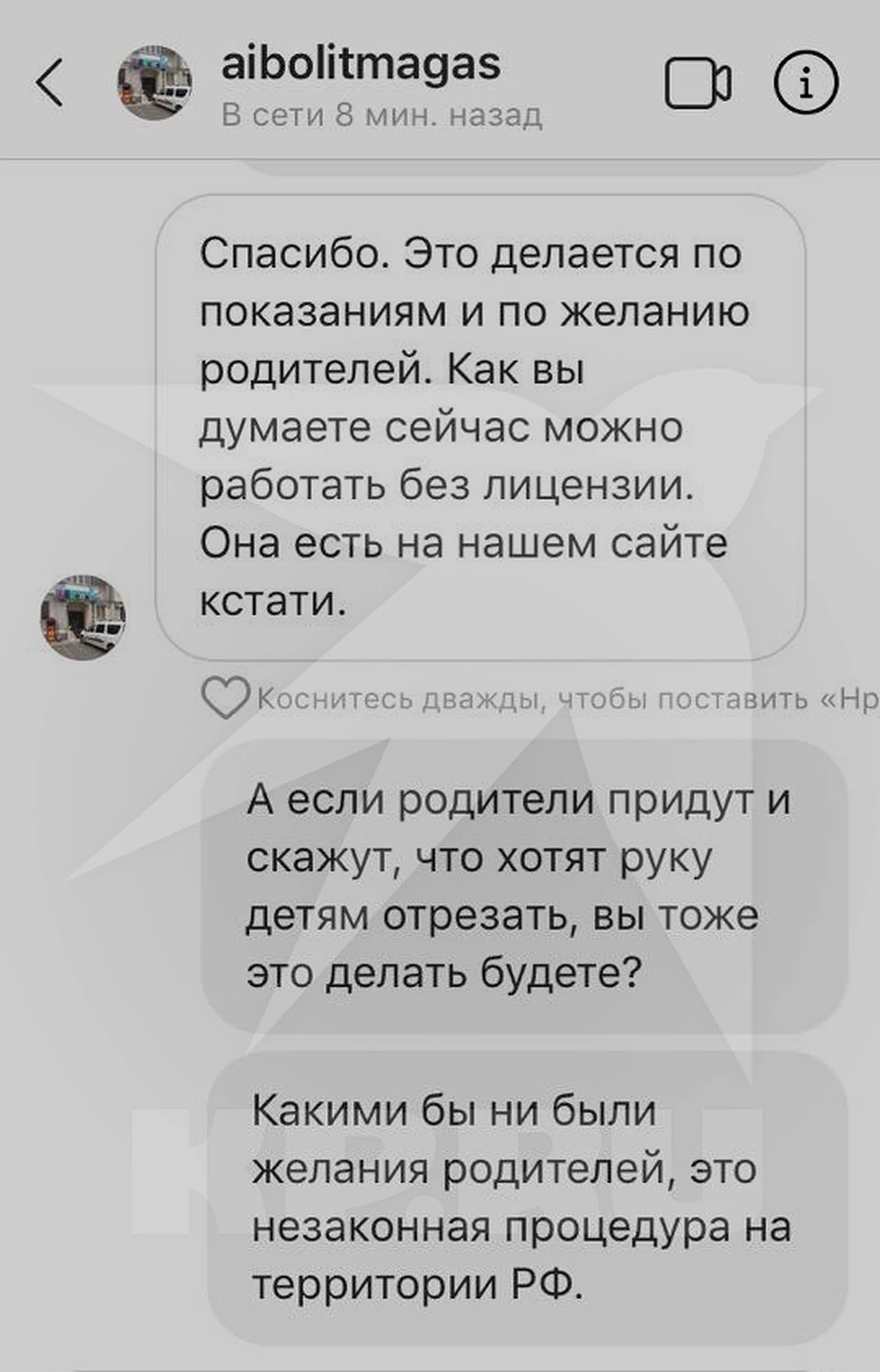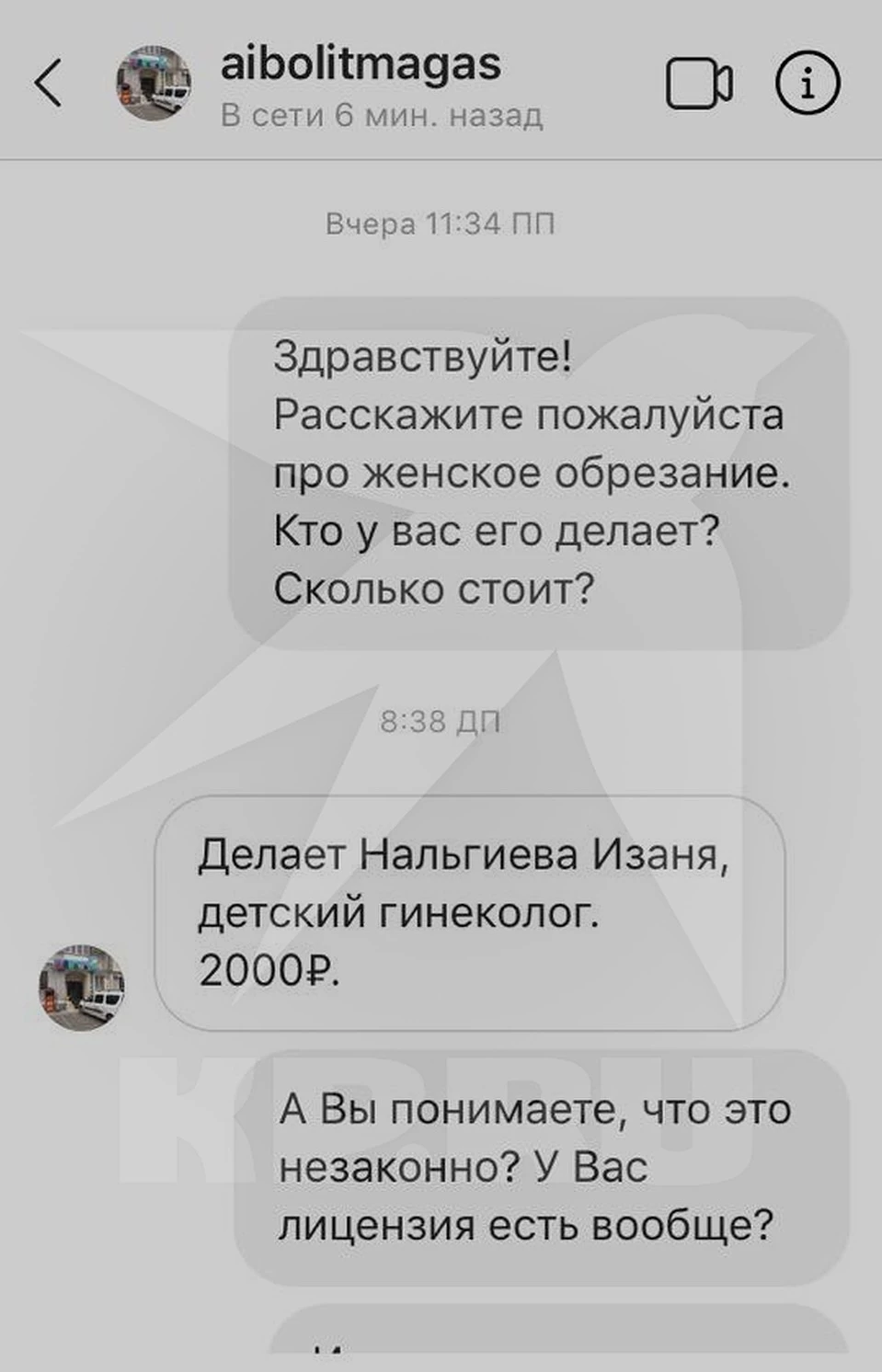 -Уже скоро год с момента начала следствия, - говорит общественный деятель Седа Тамаева. - Клиника эта и врач этот до сих пор работают, продолжают оказывать "помощь" детям. Я писала им якобы как клиент, спросила, делают ли они женское обрезание. Ответили да, цена 2000 рублей (скрин переписки прилагается). Причинение "легкого вреда здоровью" - единственное, в чем обвиняется Нальгиева. К клинике вопросов нет. При этом судья призывал стороны к примирению, ведь, цитирую, "девочке уже ничем не поможешь". У меня сложилось впечатление, что он разбирал конфликт двух женщин - врача и матери, а не преступление против прав ребенка, который всю жизнь будет оправляться от последствий физической и душевной травм.