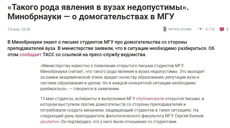 Газета с таким правдивым названием пишет, что студенты, аспиранты, преподаватели и выпускники МГУ (Московский государственный университет) им. М. В.Ломоносова опубликовали открытое письмо против сексуальных домогательств в вузе.