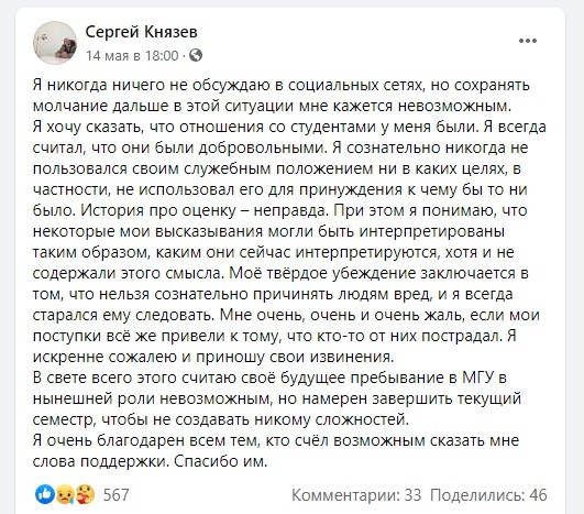 После того как прозвучали обвинения в домогательствах, уволился преподаватель филфака Сергей Князев. Кстати, в письме не упоминается ни одной фамилии. Но почему-то уволился именно Князев. И ****.com%2Fsergey.knyazev.50%2Fposts%2F2730545143735044">пишет об истории с оценкой именно он.