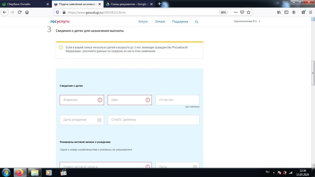 6.Внимательно введите данные свидетельства о рождении и СНИЛС вашего ребенка.