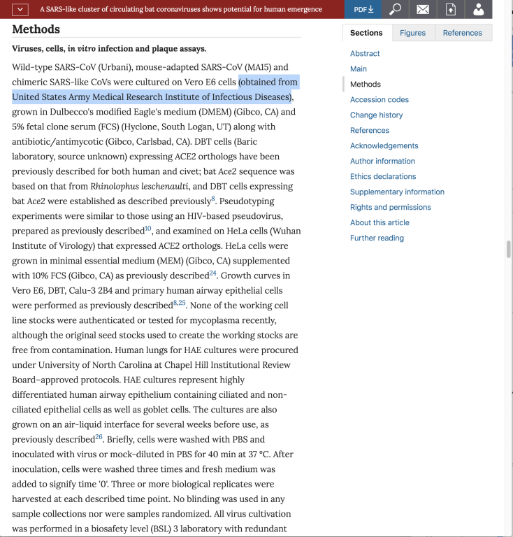 Первым делом на себя обращают внимание несколько изложенных в материале фактов. Так, в разделе «Методы» говорится, что химерные SARS-подобные CoV (искусственно созданные гибридные коронавирусы на основе SARS с разной степенью патогенности) культивировали на клетках Vero E6, полученных из Института инфекционных болезней армии США. Эта фраза заставляет сделать предположение, что кто-то из ученых или лабораторий, в которых они работают, имеет аффилиацию с этим научным учреждением.