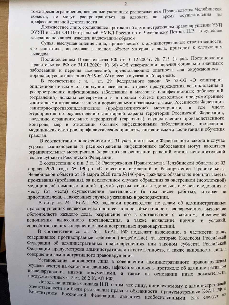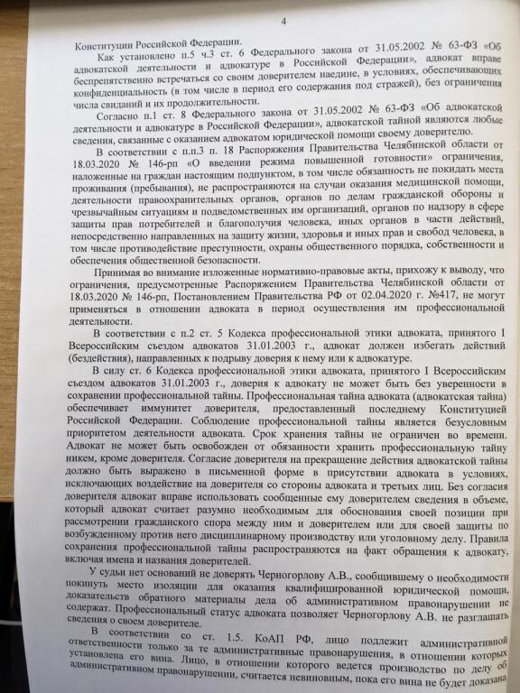 Вместе с тем, судья совершенно правильно указала, что ограничения, предусмотренные Распоряжением Правительства Челябинской области от 18.03.2020 №146-рп, Постановлением Правительства РФ от 02.04.2020 №417, не могут применяться в отношении адвоката в период осуществления им профессиональной деятельности.