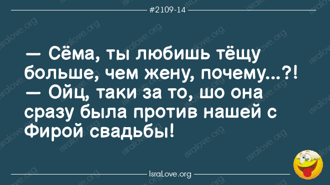 — Фима, мои соболезнования, дорогой! Говорят, у тебя тёща умерла? Боже, какая была женщина! Наверное, с сердцем шо-нибудь? — Нет. Подавилась, таки, бутербродом с чёрной икрой. Когда французский коньяк закусывала… — Шо Вы говорите… Какая красивая смерть!