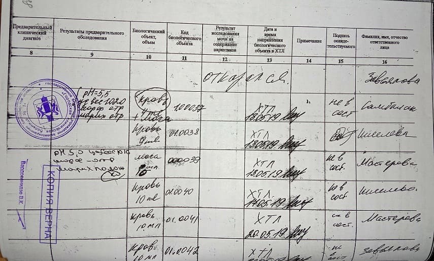 Посмотрите на журнал. У Амхадовой Н.Н. было взято всего 4 мл. крови, а у других шести пациентов 9-10 мл. крови (при положенных 15 мл.). И ведь вся эта кровь была направлена в наркологический диспансер.